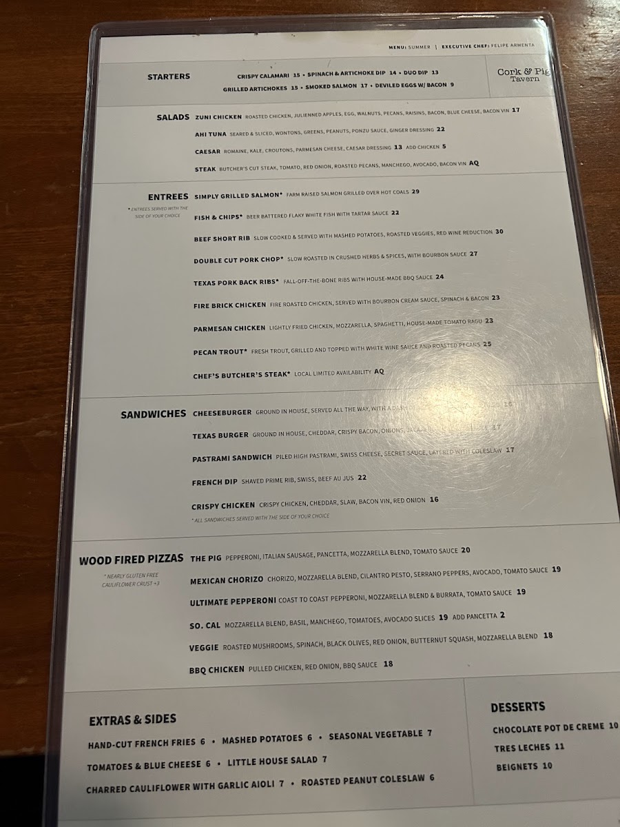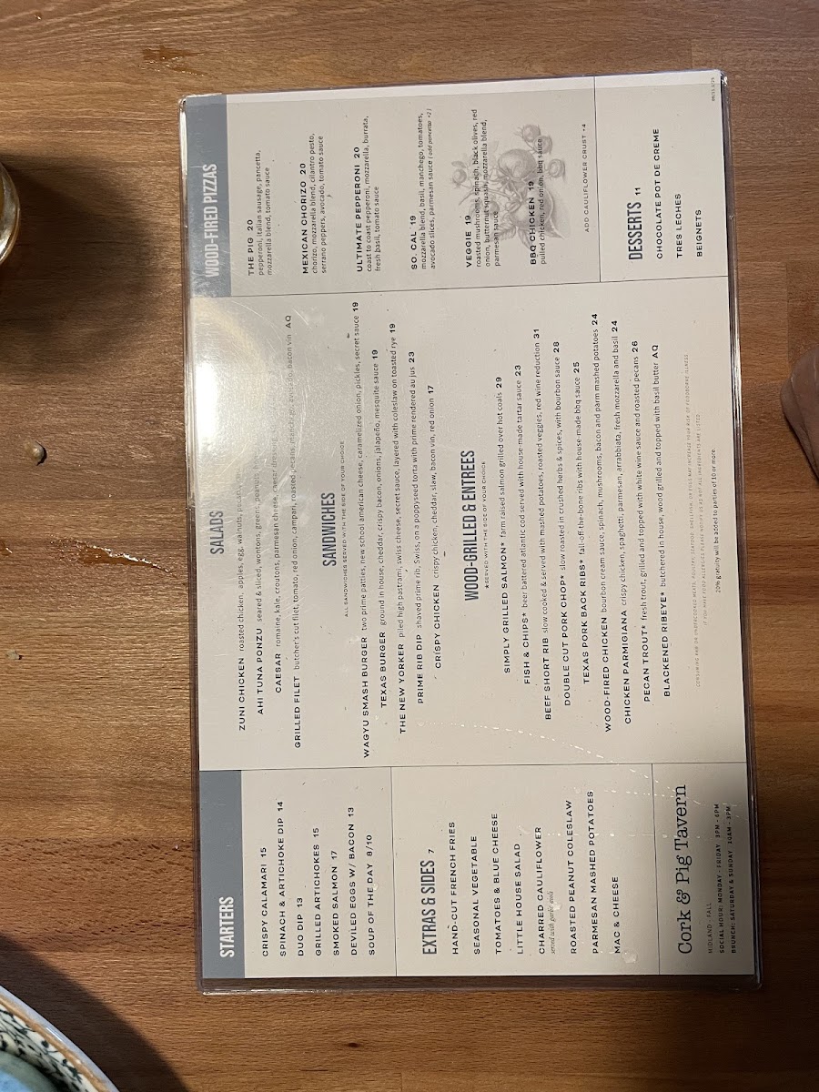 Cork & Pig Tavern offers a delightful and diverse menu that caters to a wide range of tastes, from fresh salads to savory wood-fired pizzas and hearty entrées. For those seeking a light yet flavorful start, the Zuni Chicken Salad, Ahi Tuna Salad, and Caesar Salad offer refreshing options, each bursting with vibrant flavors. Complementing the salads, their extras like Charred Cauliflower bring a deliciously smoky touch to any meal.